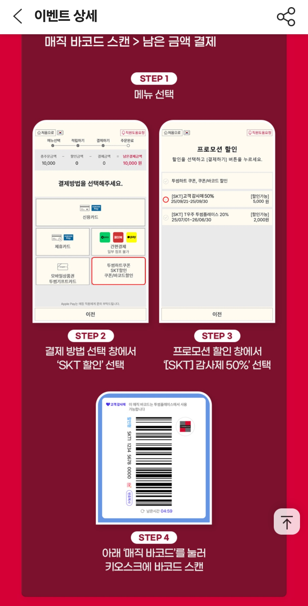 2. 스마트폰에서 티맵버십 어플 실행-> 고객감사제 선택-> 투썸 혜택 이용하러가기 선택-> 매직바코드를 선택 후 키오스크에 매직 바코드 스캔