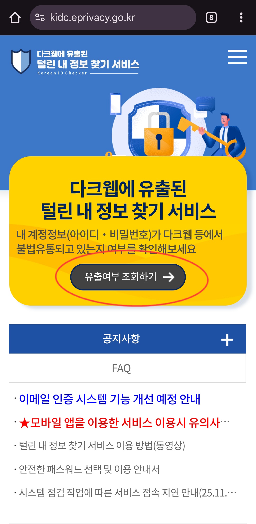 다행히 한국인터넷진흥원(KISA)과 개인정보보호위원회에서 운영하는 ‘털린 내 정보 찾기’ 서비스를 이용하면 다크웹 포함 유출 DB를 기반으로 아이디·비밀번호 유출 여부를 무료로 확인할 수 있습니다.