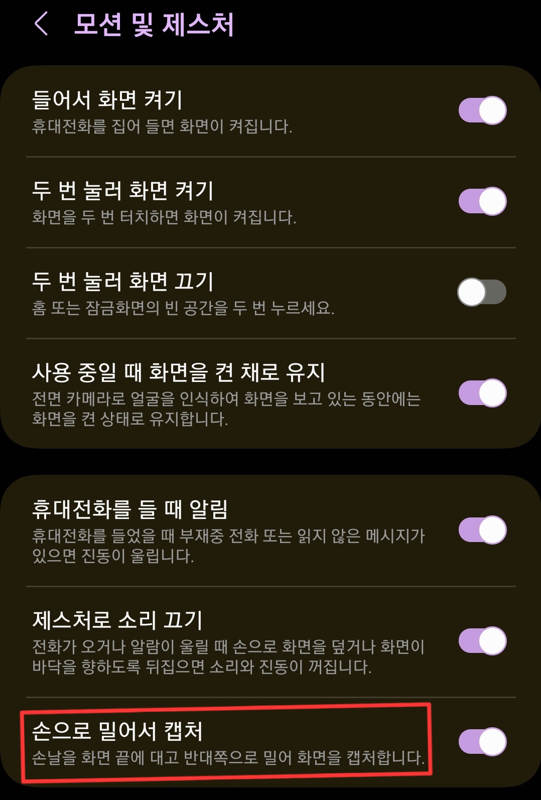 1. 설정 → 유용한 기능 → 동작 및 제스처 → 손바닥으로 캡처에서 기능을 활성화합니다.